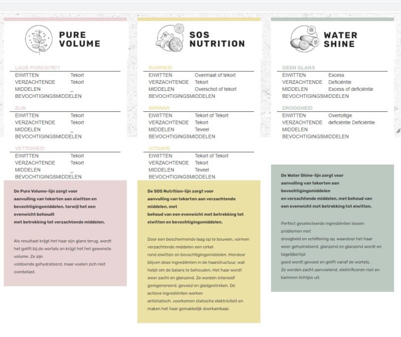 eiwitten, verzachtende middelen en bevochtigingsmiddelen in gelijke hoeveelheden in de producten is. Om het haar er